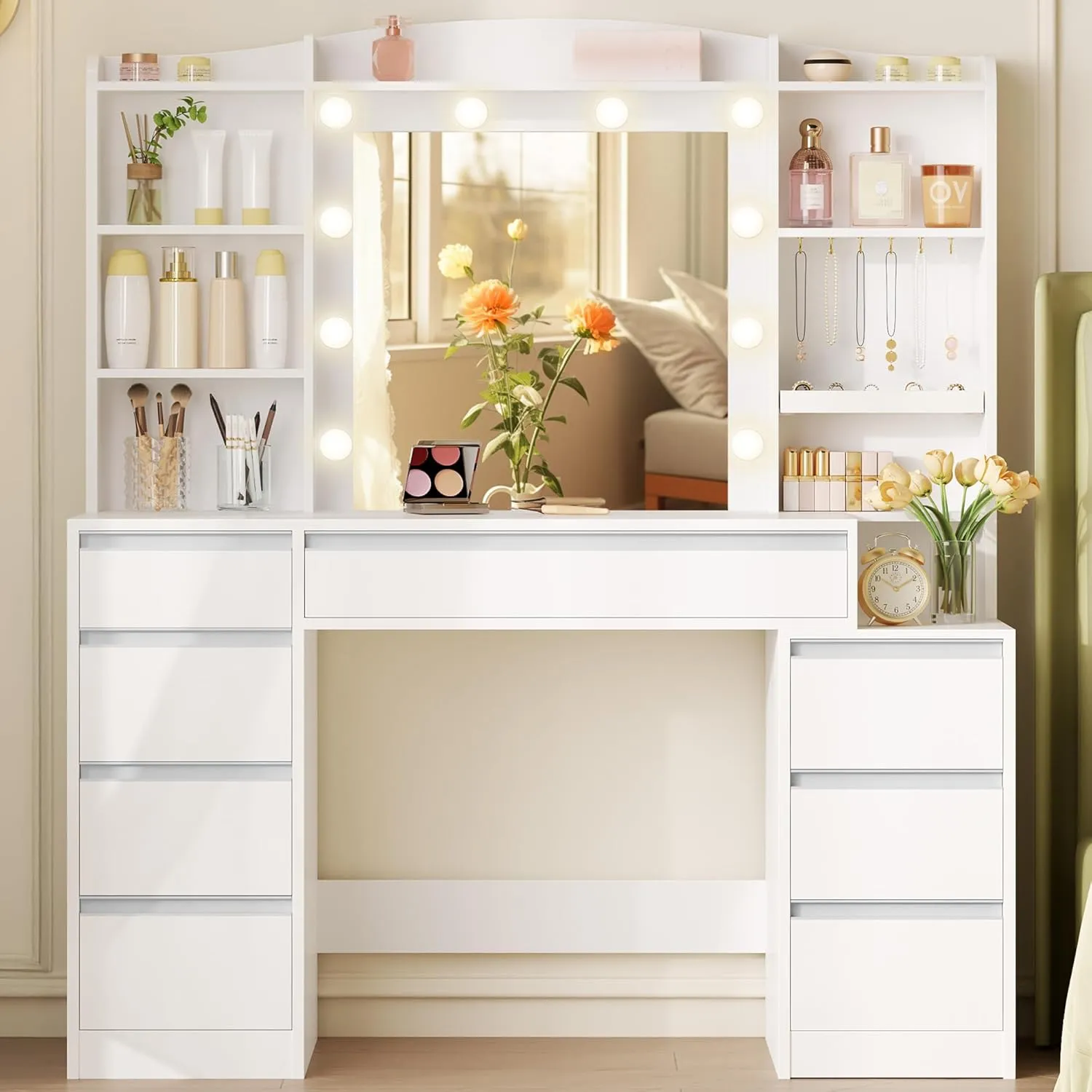 Éclairage ajustable : Permet un réglage facile de la lumière de 3000K à 6000K pour différents styles de maquillage. Lumière RGB colorée : Comprend une ampoule LED RGB avec 20 couleurs pour créer diverses ambiances. Rangement pour bijoux : Espace dédié avec fentes en velours pour les bagues et boucles d'oreilles, et crochets pour colliers. Aménagement de l'espace : Grand plan de travail de 100 cm et étagères ouvertes à trois niveaux pour organiser les articles cosmétiques à portée de main. Rangement des tiroirs : Tiroir central et petit tiroir latéral pour divers outils de beauté et produits de soins. Table de nuit intégrée : Design en creux avec espace pour bougies, livres, téléphones et petits objets, et trois tiroirs en dessous.